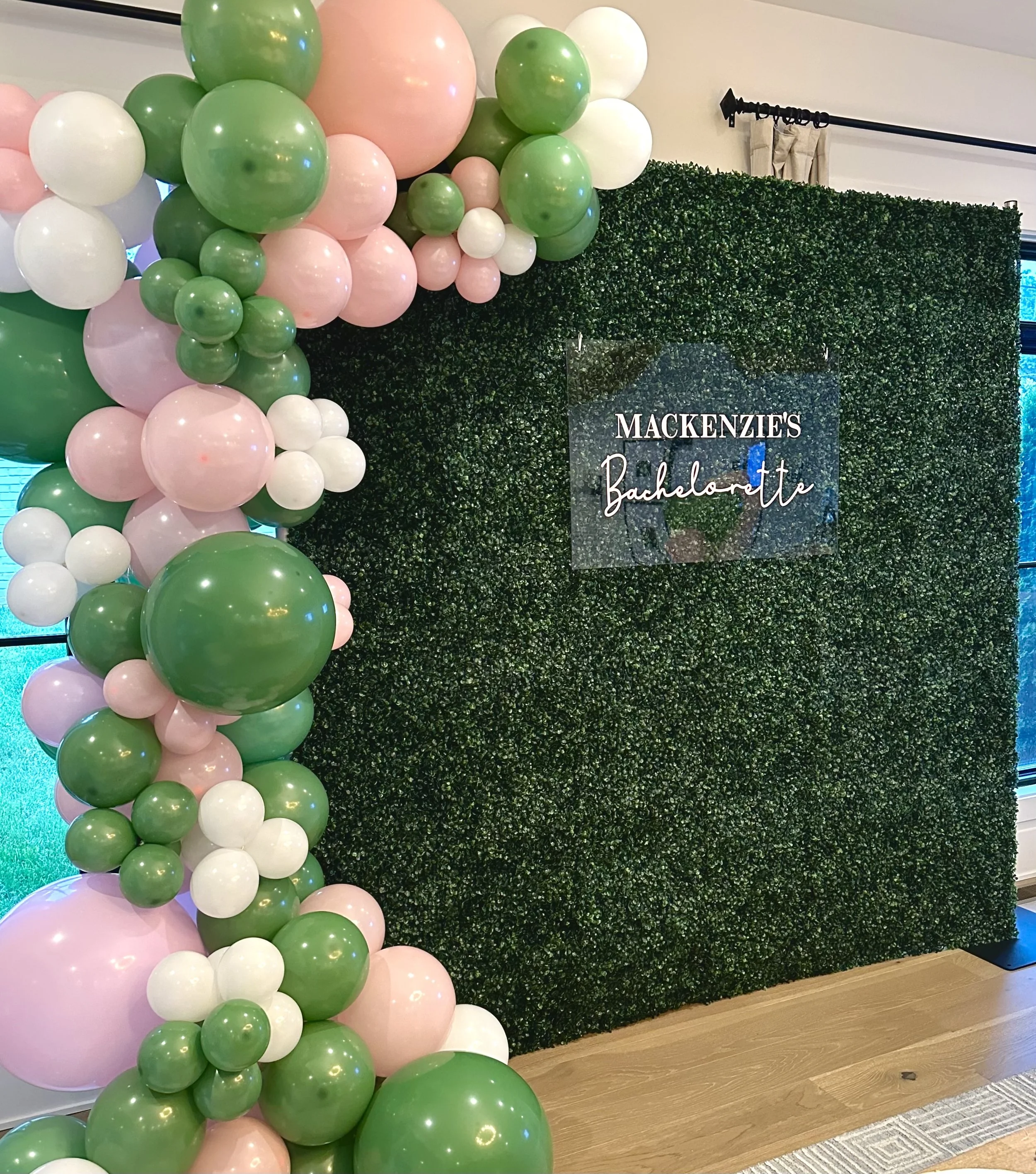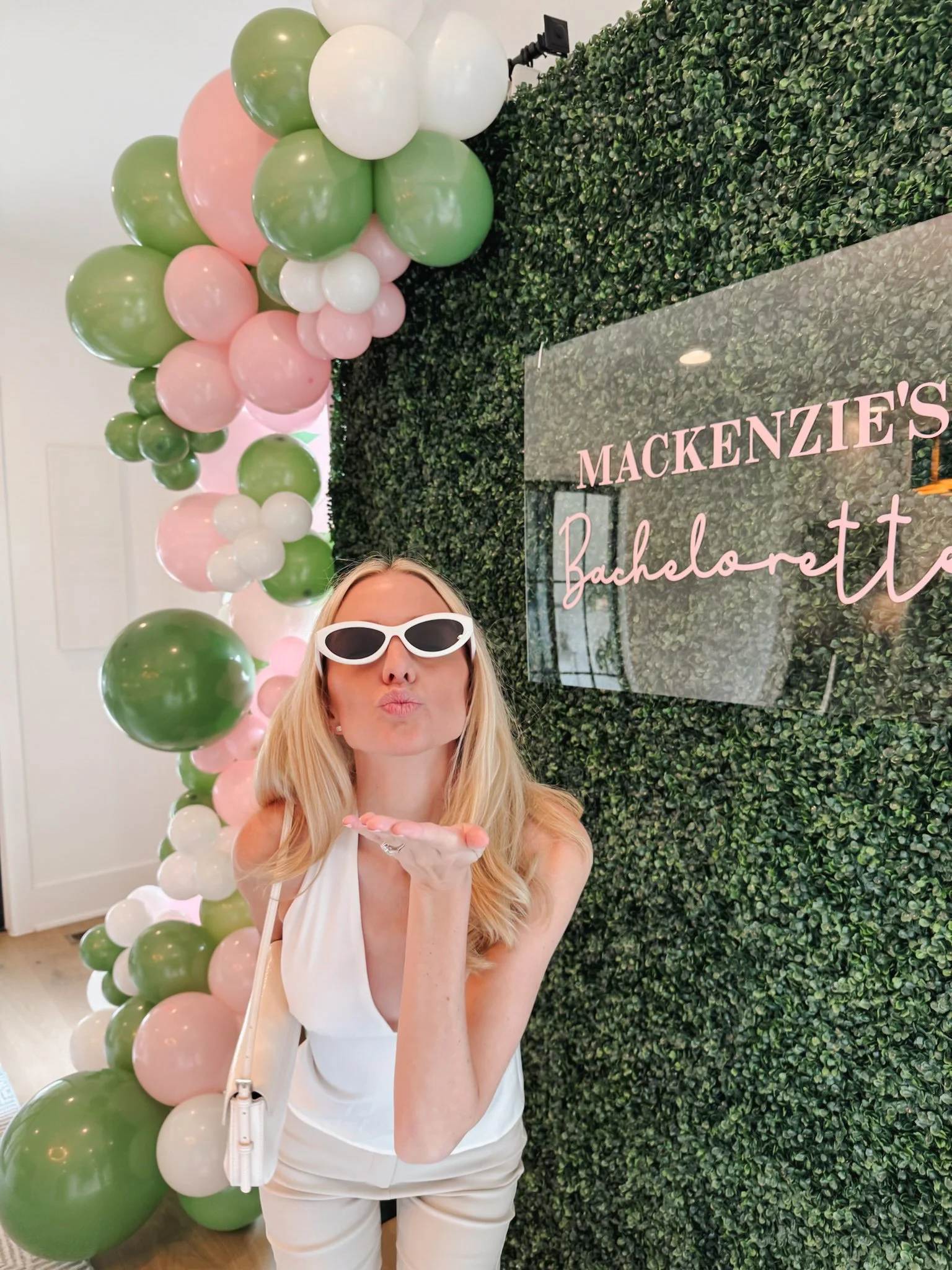 Balloon arch & photo backdrop w/ neon sign, bridal room decor, themed banner, and veil, sash, and sunglasses for the bride.